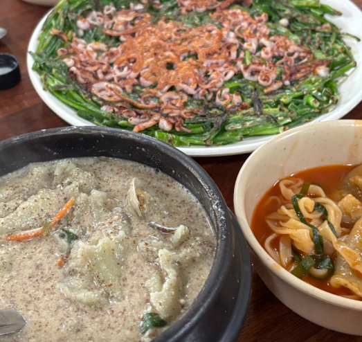 A. 꼭 드셔보세요. 오징어가 아낌없이 들어가고 바삭해서 수제비랑 궁합이 최고입니다.